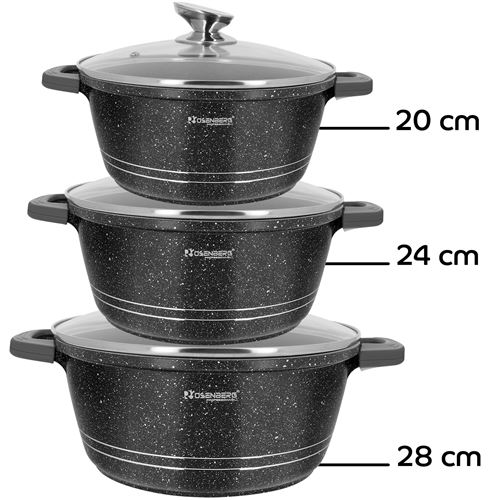 Découvrez le set de 3 faitouts Rosenberg au revêtement anti-adhérent effet pierre, conçu pour une cuisine saine, pratique et durable. Grâce à leur surface antiadhésive, la cuisson est maîtrisée sans ajout excessif de matière grasse, et le nettoyage devient un jeu d’enfant.