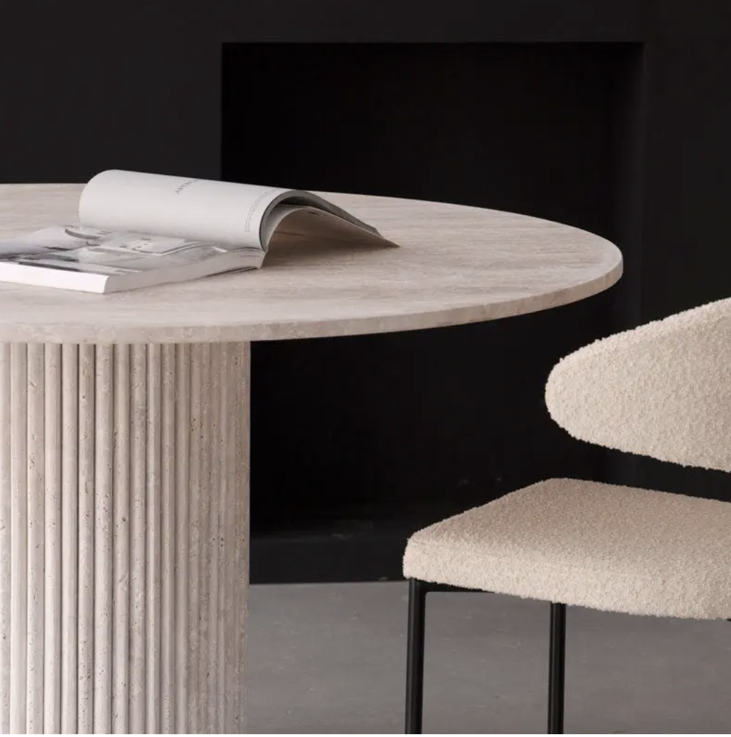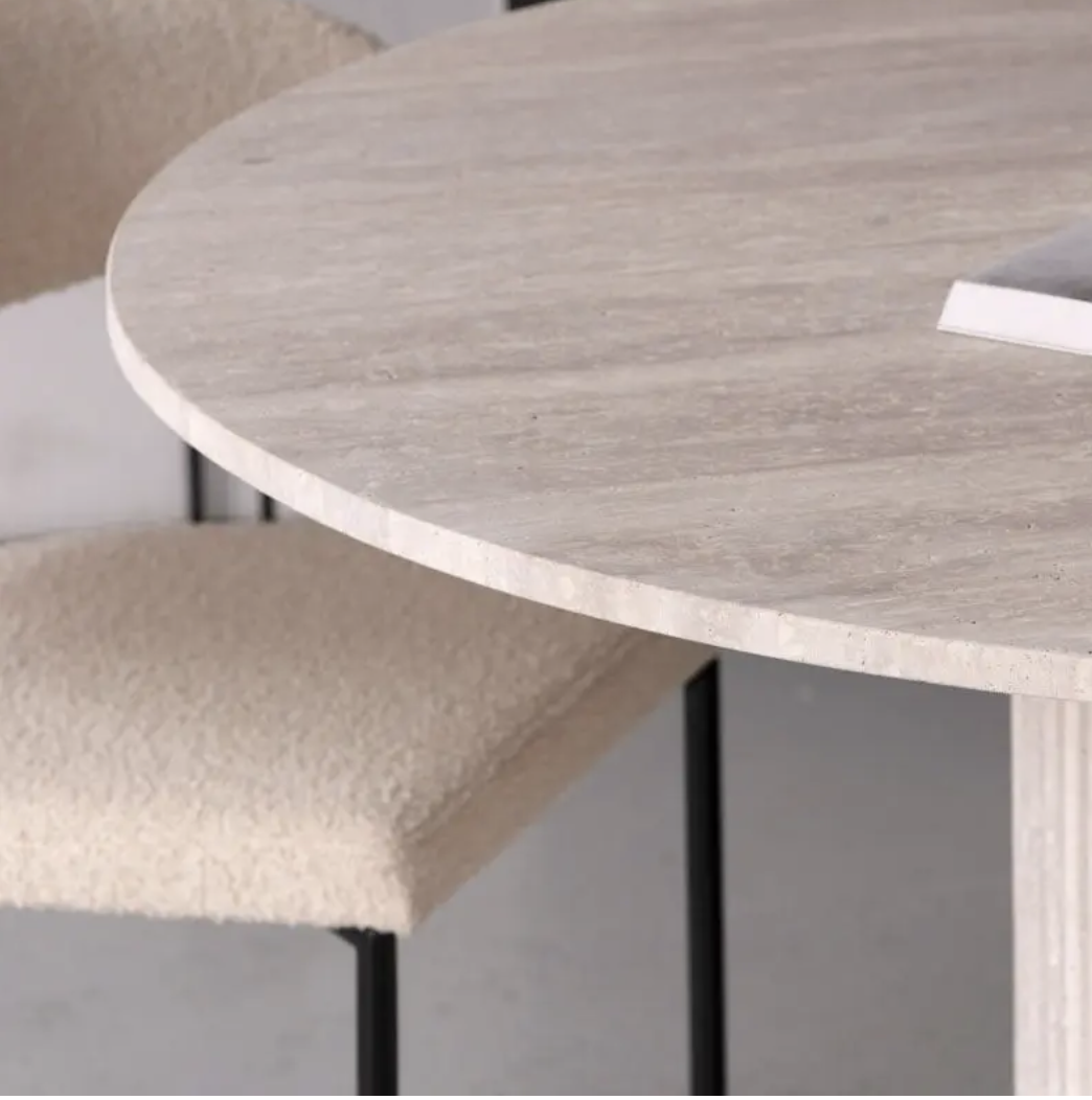 Table ronde 120 cm en travertin naturel, piètement travertin, idéale pour votre salle à manger ou salon. Frais de port offerts et contactez-nous