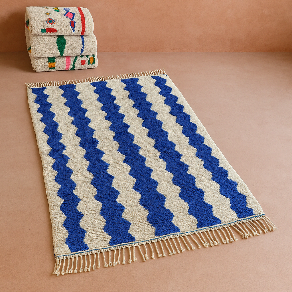 Ce tapis en laine tissée à la main met à l’honneur un motif graphique de vagues bleues profondes sur fond écru. Le contraste audacieux entre les lignes ondulées et les couleurs pures lui confère une touche contemporaine tout en restant fidèle au savoir-faire berbère. Il apporte du rythme et de la personnalité à n’importe quelle pièce.
